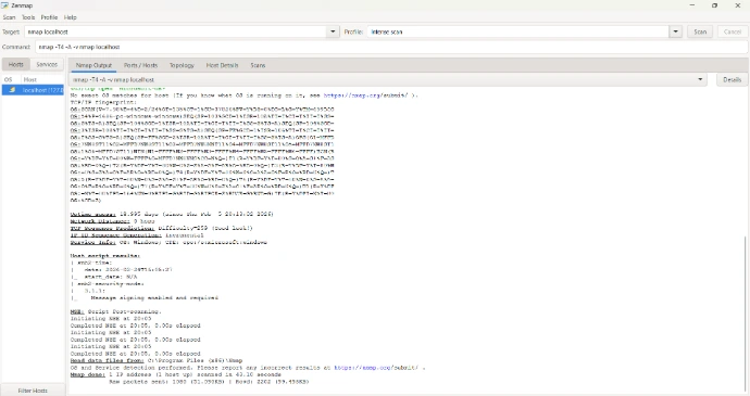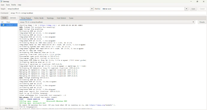 I performed a network scan using Nmap (Intense Scan Profile) to analyze open ports and services running on my local machine (127.0.0.1).